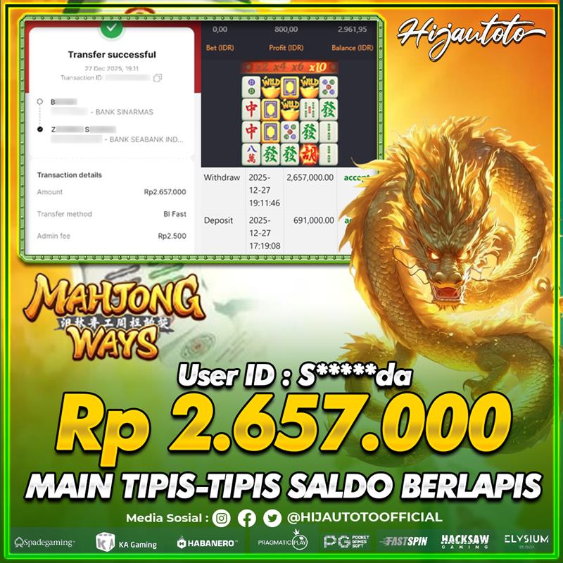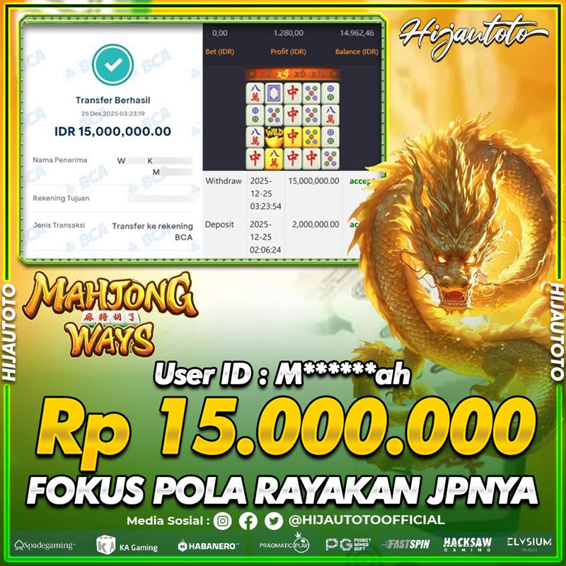 Selamat Kepada Member HIJAUTOTO M*******DI Telah Jackpot Di SLOT MAHJONG WAYS