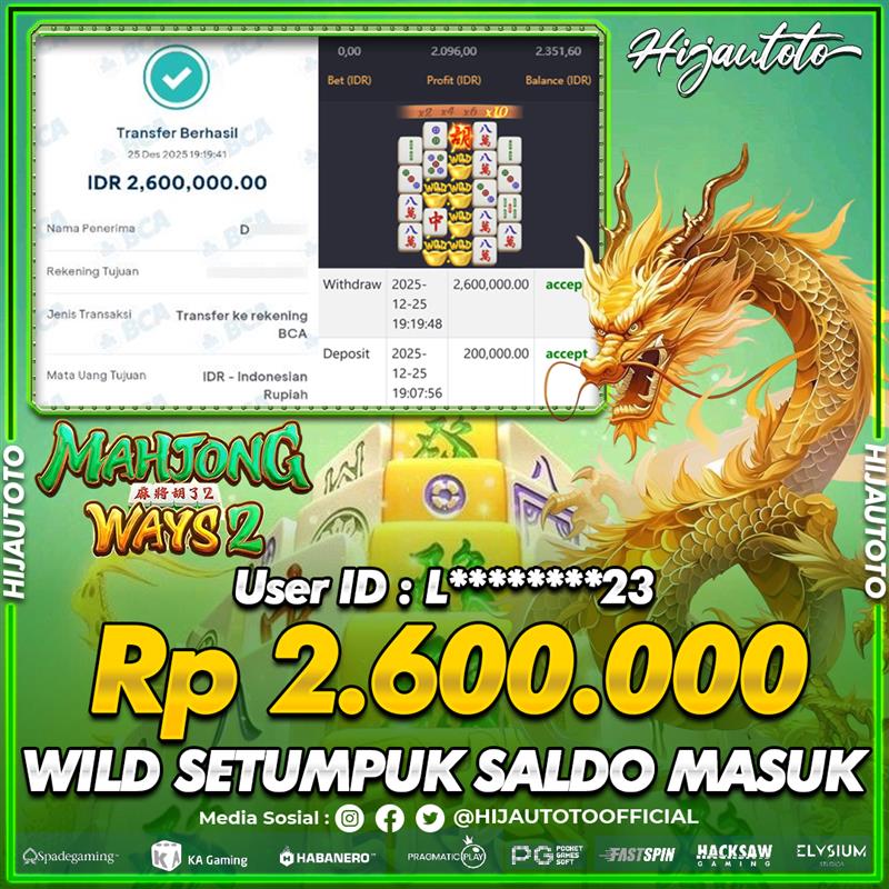 Selamat Kepada Member HIJAUTOTO L********23 Telah Jackpot Di SLOT MAHJONG WAYS 2