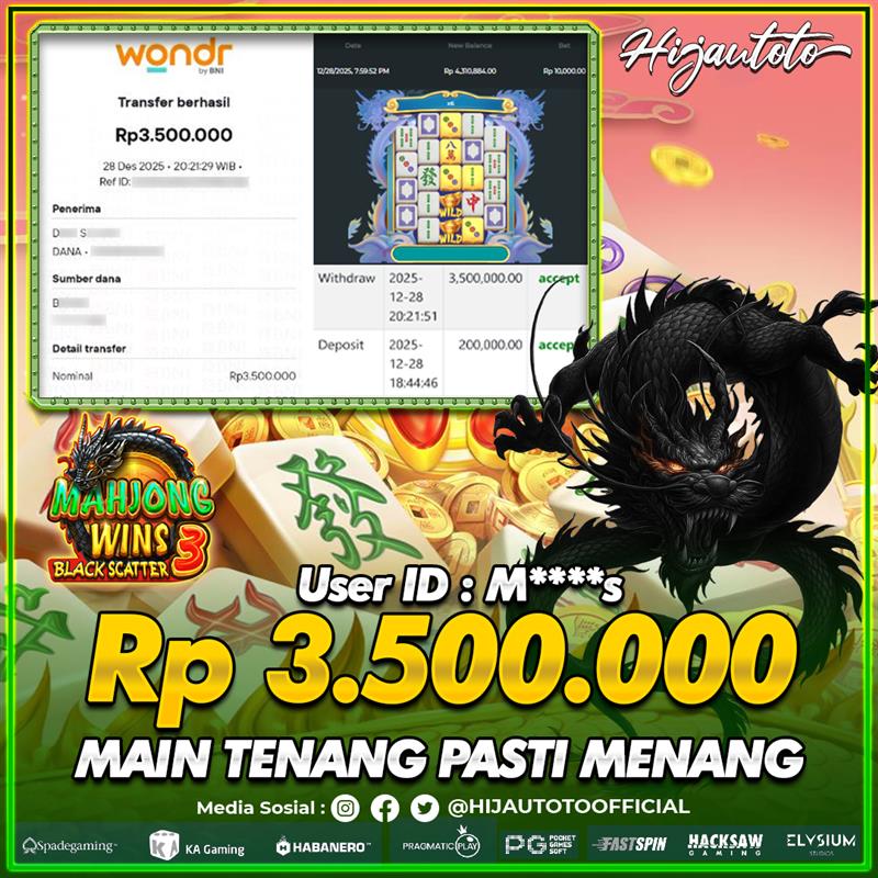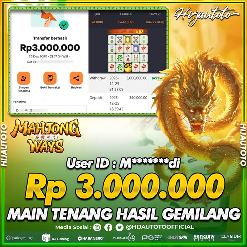 Selamat Kepada Member HIJAUTOTO M******AH Telah Jackpot Di SLOT MAHJONG WAYS