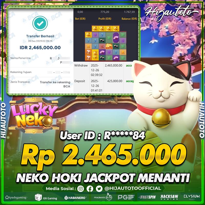 Selamat Kepada Member HIJAUTOTO R*****84 Telah Jackpot Di SLOT LUCKY NEKO
