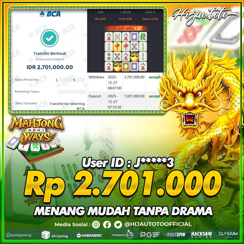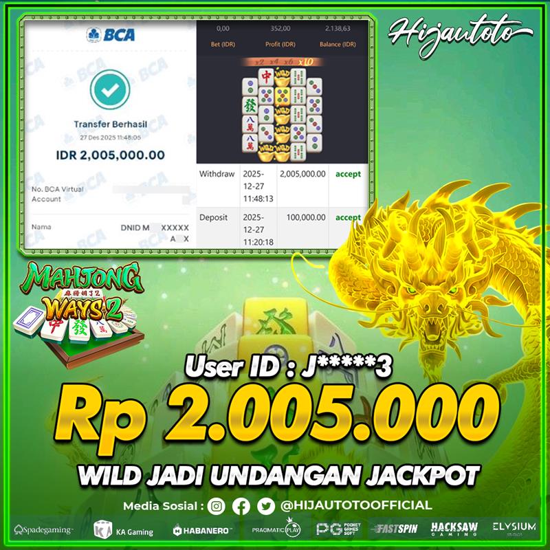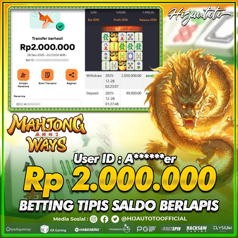 Selamat Kepada Member HIJAUTOTO A******ER Telah Jackpot Di SLOT MAHJONG WAYS