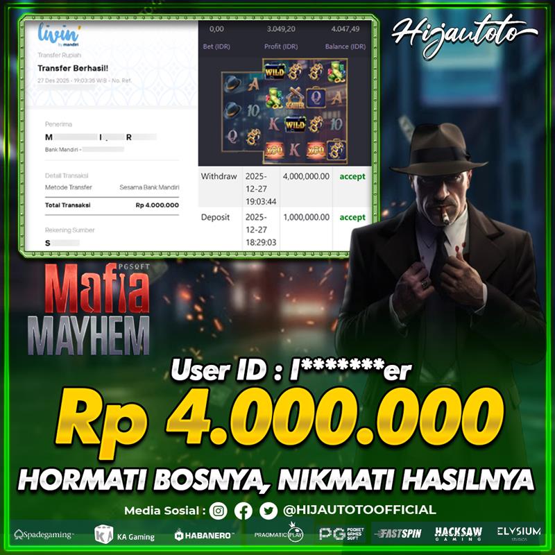 Selamat Kepada Member HIJAUTOTO I*******ER Telah Jackpot Di SLOT MAFIA MAYHEM