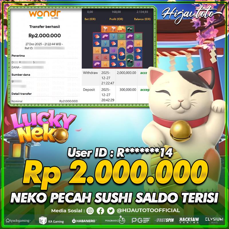 Selamat Kepada Member HIJAUTOTO R*******14 Telah Jackpot Di SLOT LUCKY NEKO