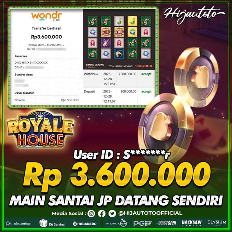 Selamat Kepada Member HIJAUTOTO S*******R Telah Jackpot Di SLOT ROYALE