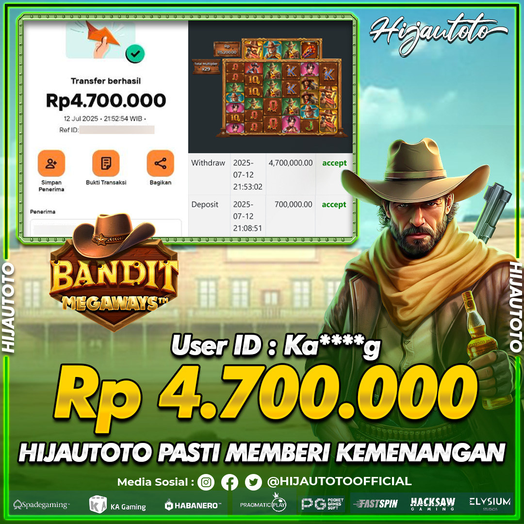 Selamat Kepada Member HIJAUTOTO KA****9 Telah Jackpot Di SLOT BANDIT MEGAWAYS