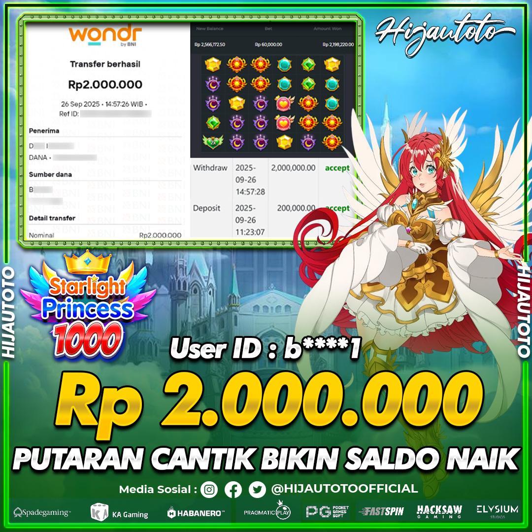 Selamat Kepada Member HIJAUTOTO B****1 Telah Jackpot Di SLOT STARLIGHT PRINCESS 1000
