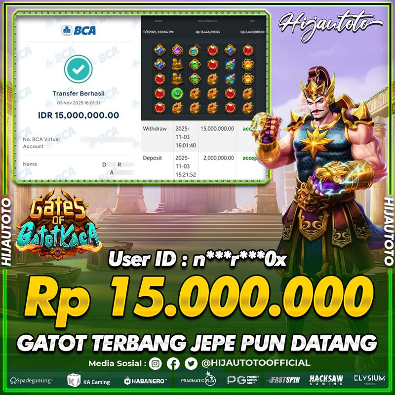 Selamat Kepada Member HIJAUTOTO N*******0X Telah Jackpot Di SLOT GATES OF GATOTKACA