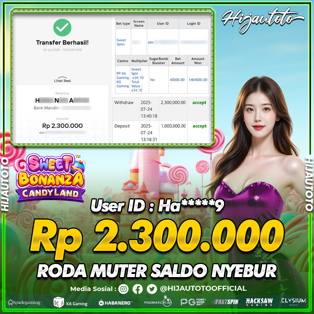 Selamat Kepada Member HIJAUTOTO HA*****9 Telah Jackpot Di LIVE CASINO SWEET BONANZA CANDYLAND
