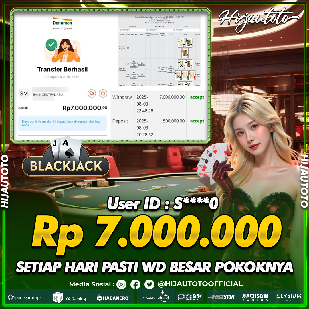 Selamat datang di HIJAUTOTO, tempatnya seru-seruan dan cuan besar! Mulai main cukup dengan modal Rp5.000 aja, taruhan super murah dari Rp100 perak! Mau main slot yang penuh warna? Atau togel dari 20 pasaran paling hits? Atau mungkin tembak ikan yang bikin deg-degan? Tenang, ada juga taruhan bola, sabung ayam, dan live casino yang bikin suasana makin hidup! Daftar sekarang dan dapetin bonus new member 100% langsung, biar modalmu makin tebal. Deposit gampang banget, bisa pakai QRIS, dan kalau butuh bantuan, customer service kita siap 24 jam nonstop. Jadi, tunggu apa lagi? Yuk, gabung dan bawa pulang kemenangannya cuma di HIJAUTOTO!