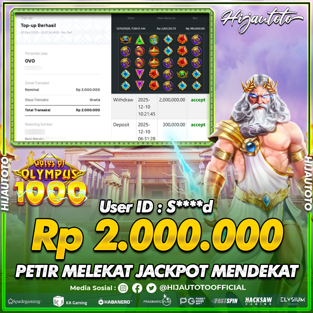Selamat Kepada Member HIJAUTOTO JH****2 Telah Jackpot Di SLOT GATES OF OLYMPUS SUPER SCATTER