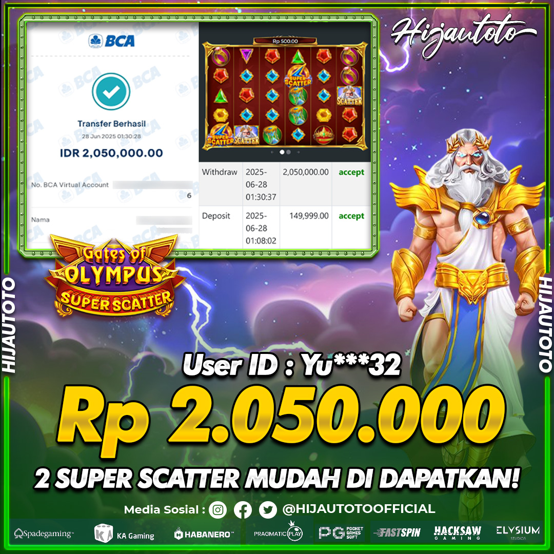 Selamat Kepada Member HIJAUTOTO YU****2 Telah Jackpot Di SLOT GATES OF OLYMPUS SUPER SCATTER
