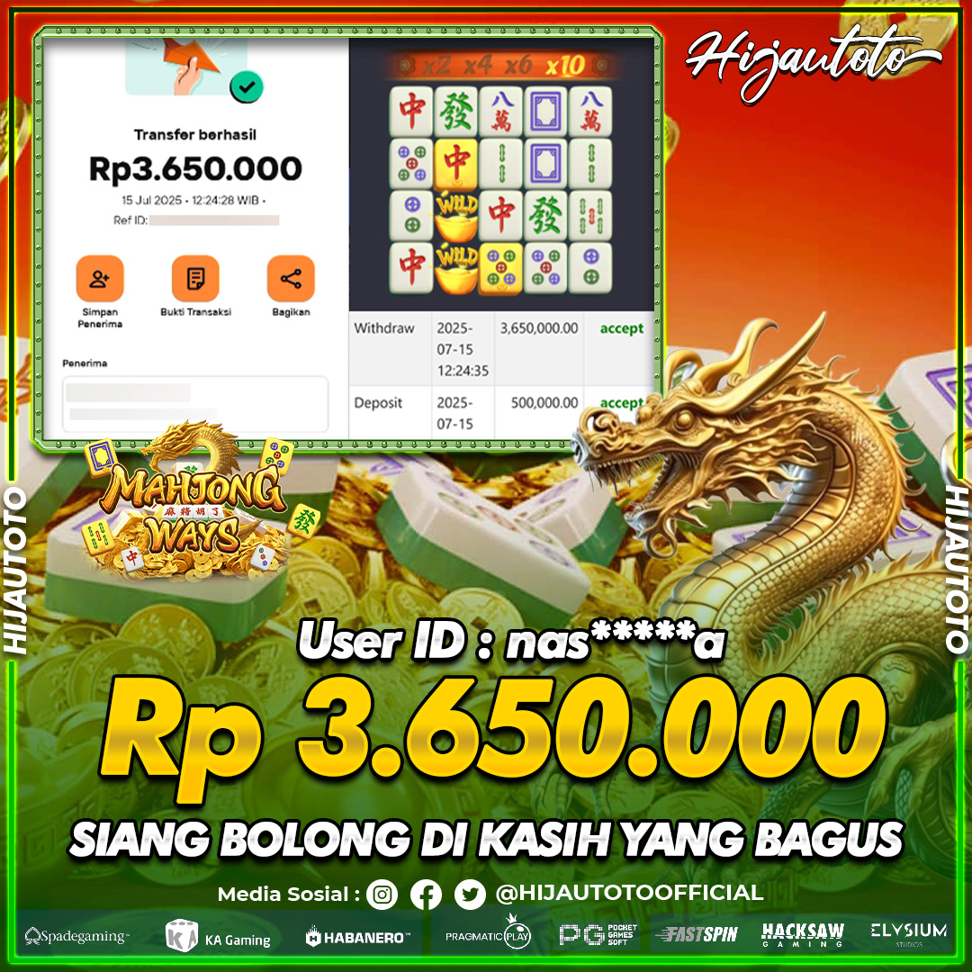 Karena berhasil memenangkan Rp.Rp.3.400.000 dari permainan seru SLOT MAHJONG WAYS di HIJAUTOTO! πŸ’°πŸ’Έ