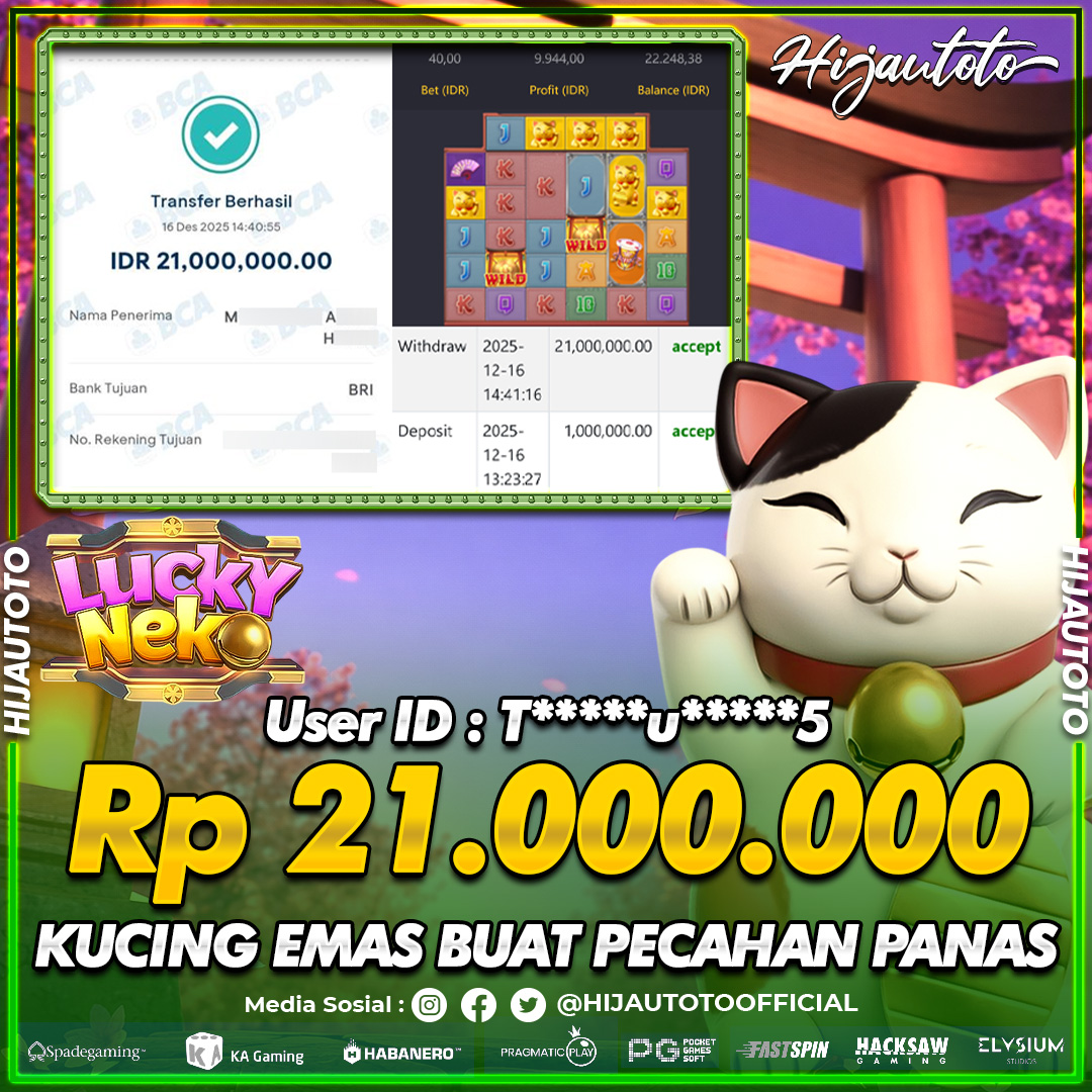 Selamat Kepada Member HIJAUTOTO T***********5 Telah Jackpot Di SLOT LUCKY NEKO