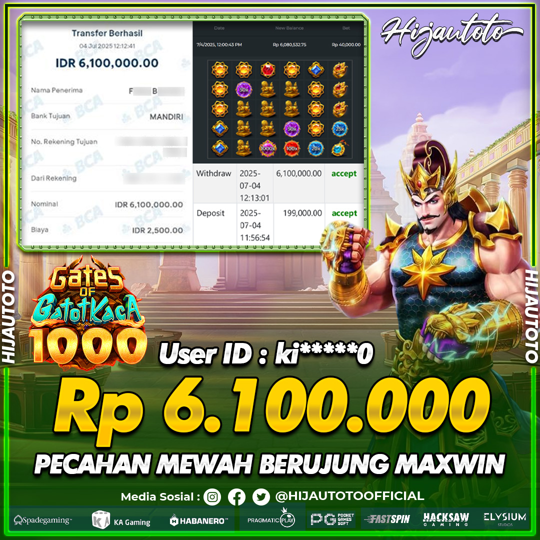 Selamat Kepada Member HIJAUTOTO KI*****0 Telah Jackpot Di SLOT GATES OF GATOTKACA 1000