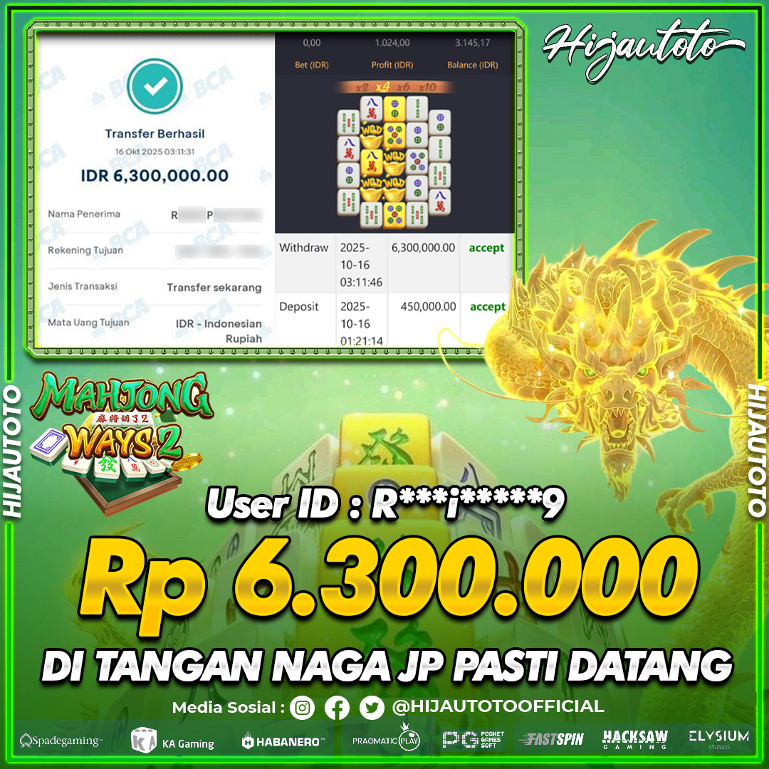 Selamat Kepada Member HIJAUTOTO R***I*******9 Telah Jackpot Di SLOT MAHJONG WAYS 2