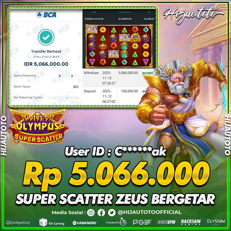 Selamat Kepada Member HIJAUTOTO C*****AK Telah Jackpot Di SLOT GATES OF OLYMPUS SUPER SCATTER