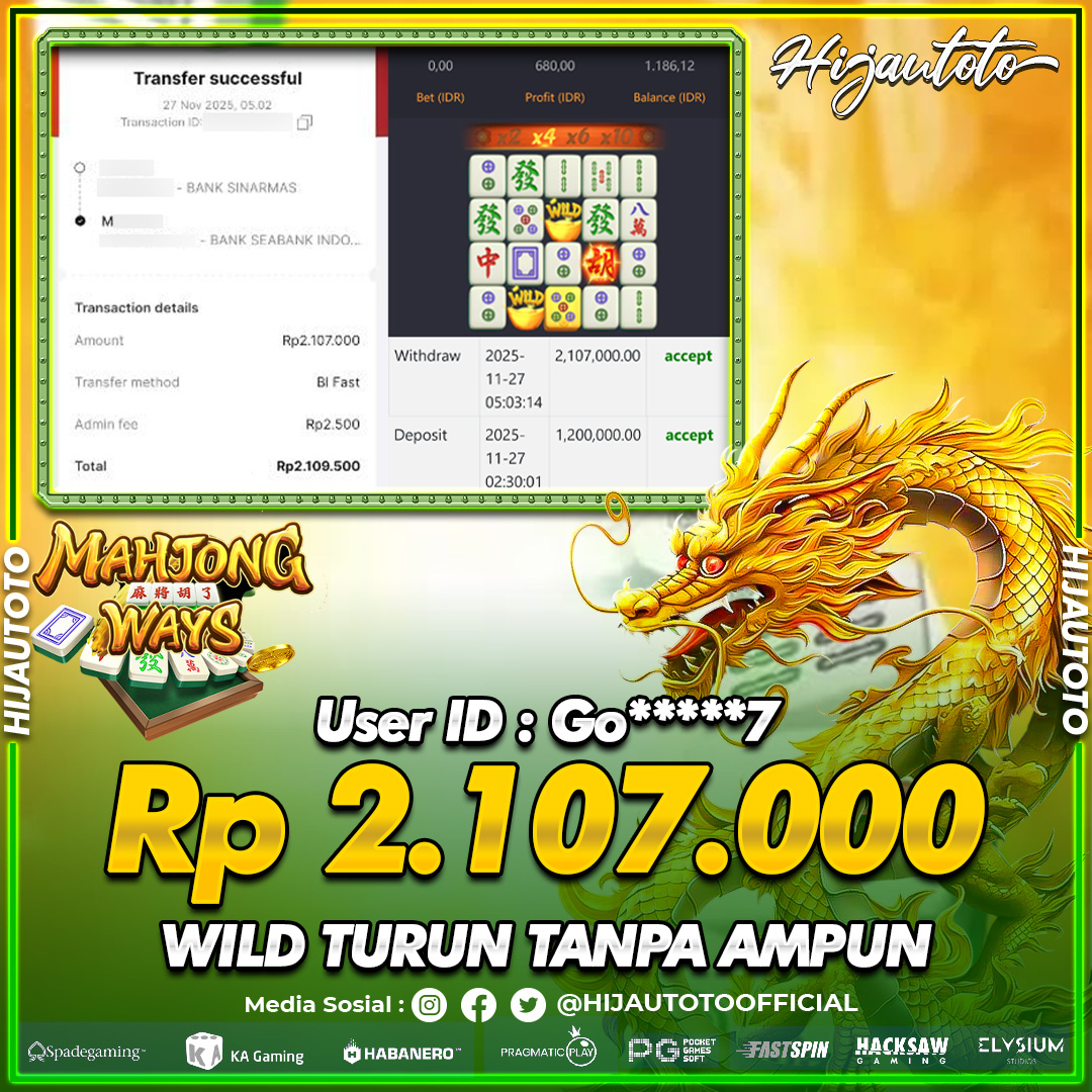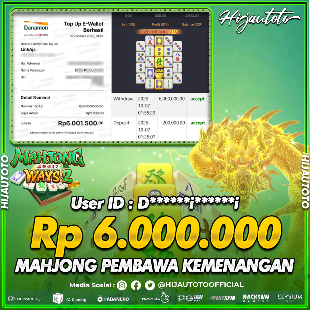 Selamat Kepada Member HIJAUTOTO GO*****7 Telah Jackpot Di SLOT MAHJONG WAYS