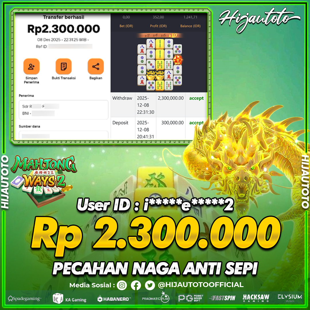 Selamat Kepada Member HIJAUTOTO I*********2 Telah Jackpot Di SLOT MAHJONG WAYS 2