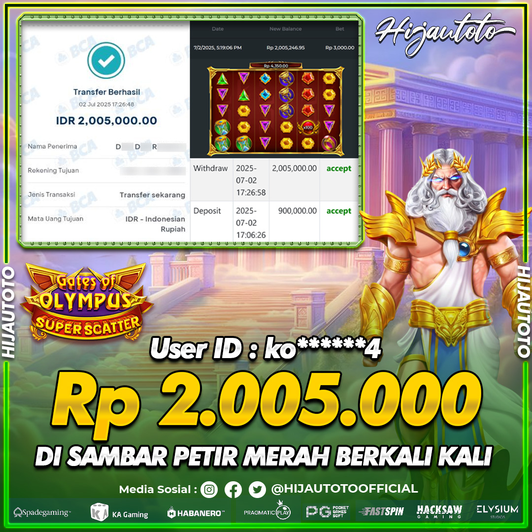 Karena berhasil memenangkan Rp.Rp.2.300.000 dari permainan seru SLOT GATES OF OLYMPUS SUPER SCATTER di HIJAUTOTO! πŸ’°πŸ’Έ