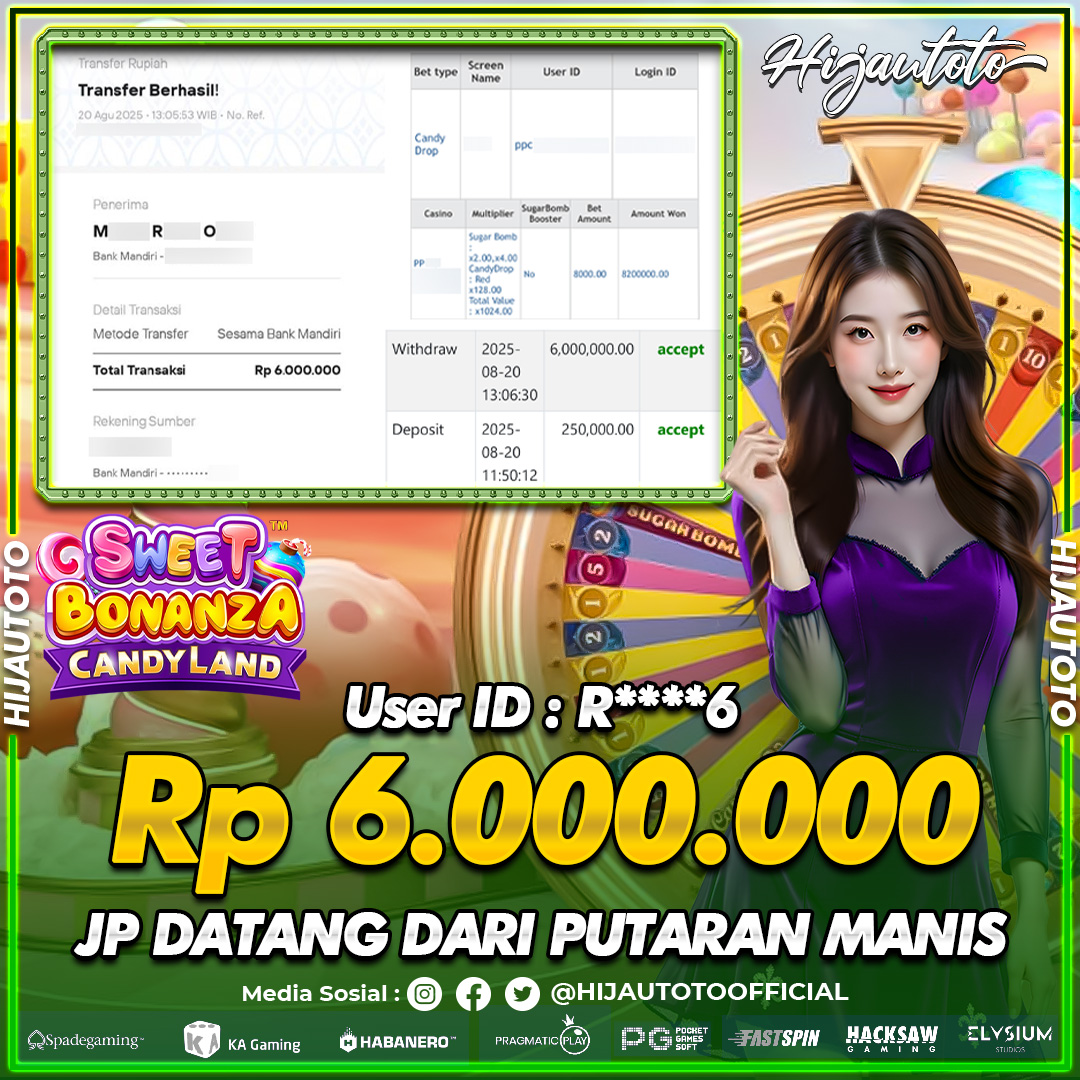 Selamat Kepada Member HIJAUTOTO R****6 Telah Jackpot Di LIVE CASINO SWEET BONANZA CANDYLAND