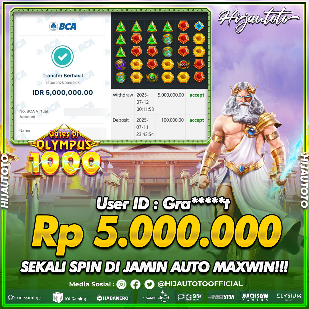 Selamat Kepada Member HIJAUTOTO GRA*****T Telah Jackpot Di SLOT GATES OF OLYMPUS 1000