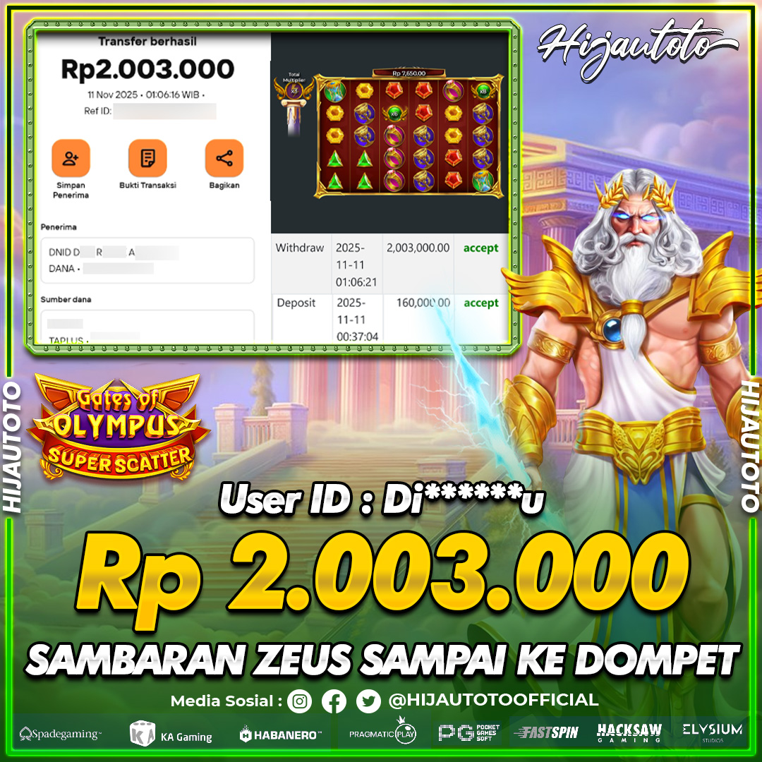Selamat Kepada Member HIJAUTOTO N******A Telah Jackpot Di SLOT GATES OF OLYMPUS SUPER SCATTER
