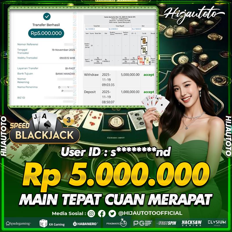 Selamat Kepada Member HIJAUTOTO S*******ND Telah Jackpot Di SLOT SPEED BLACKJACK 3
