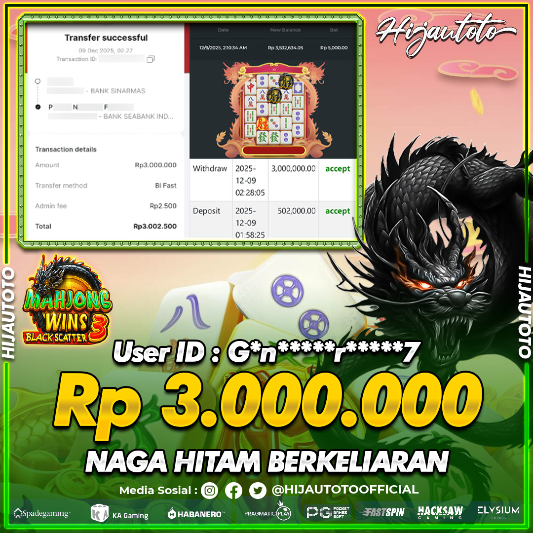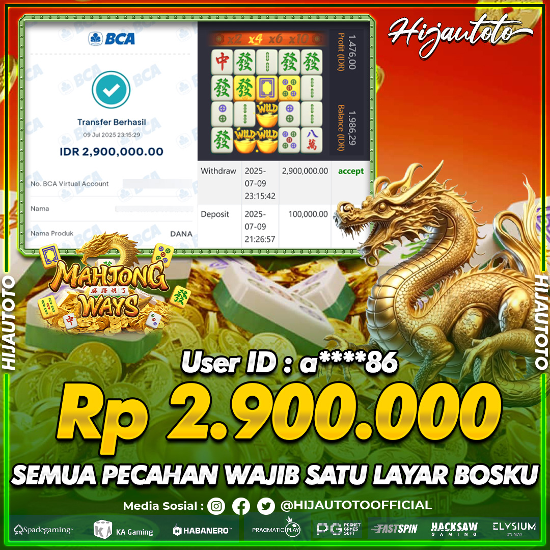Selamat Kepada Member HIJAUTOTO A*****6 Telah Jackpot Di SLOT MAHJONG WAYS
