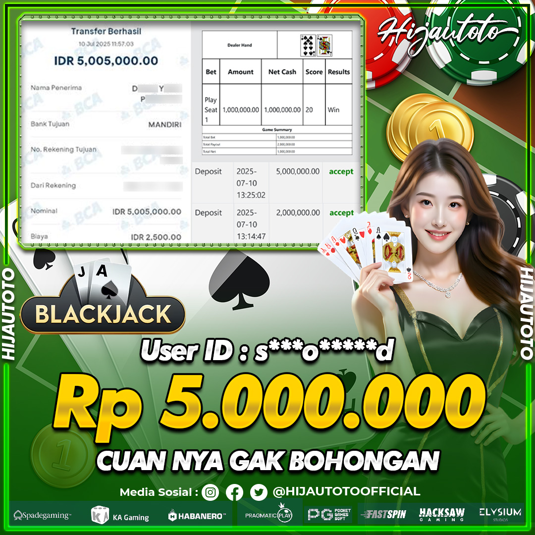 Selamat datang di HIJAUTOTO, tempatnya seru-seruan dan cuan besar! Mulai main cukup dengan modal Rp5.000 aja, taruhan super murah dari Rp100 perak! Mau main slot yang penuh warna? Atau togel dari 20 pasaran paling hits? Atau mungkin tembak ikan yang bikin deg-degan? Tenang, ada juga taruhan bola, sabung ayam, dan live casino yang bikin suasana makin hidup! Daftar sekarang dan dapetin bonus new member 100% langsung, biar modalmu makin tebal. Deposit gampang banget, bisa pakai QRIS, dan kalau butuh bantuan, customer service kita siap 24 jam nonstop. Jadi, tunggu apa lagi? Yuk, gabung dan bawa pulang kemenangannya cuma di HIJAUTOTO!