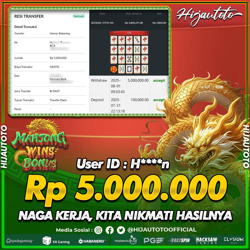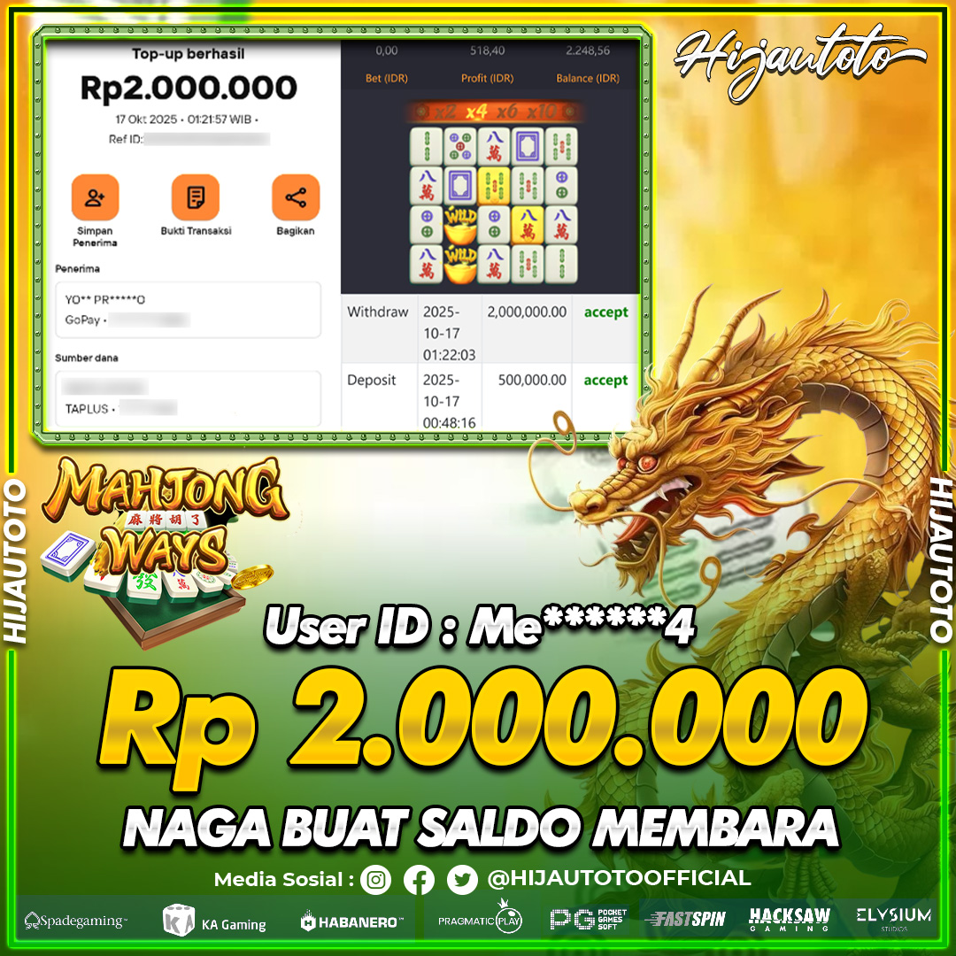Selamat Kepada Member HIJAUTOTO H****N Telah Jackpot Di SLOT MAHJONG WINS BONUS